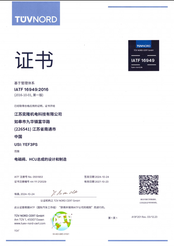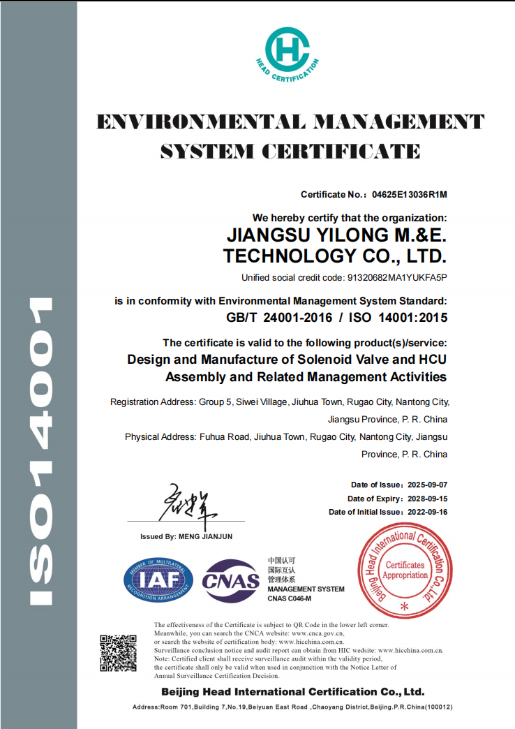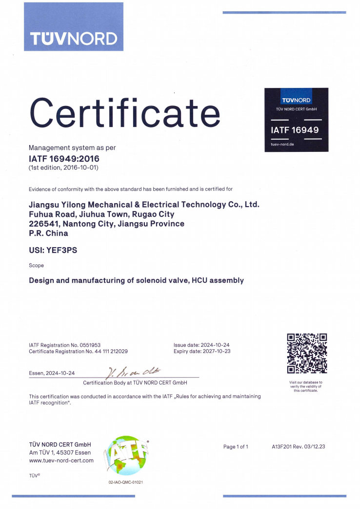 Jiangsu Yilong M.&E. Technology Co., Ltd. specializes in the research and development, production and sales of electromagnetic valves and HCU for electric control systems. Yilong has the largest production capacity of electromagnetic valves for automotive brake systems in China currently. Yilong is also the domestic company to achieve serialization and standardized design of electromagnetic valves. It is a national high-tech enterprise that realizes full automation and large-scale production for the first time.
